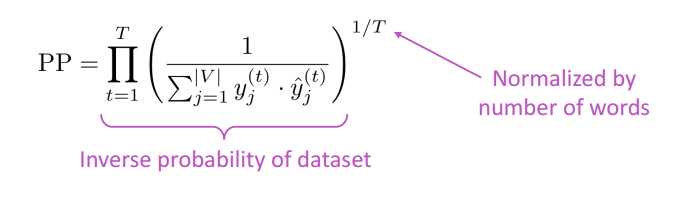 迷惑度/困惑度/混乱度(perplexity),其基本思想是给测试集的句子赋予较高概率值的语言模型较好,当语言模型训练完之后,测试集中的句子都是正常的句子,那么训练好的模型就是在测试集上的概率越高越好。迷惑度越小,句子概率越大,语言模型越好。