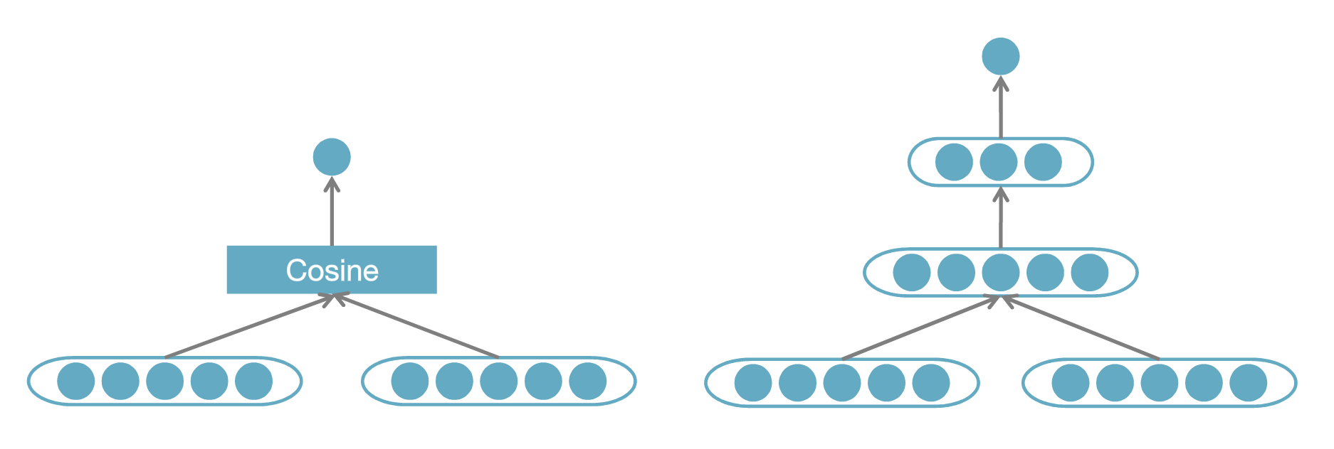 该方式下,更侧重对表示层的构建,尽可能充分地将待匹配的两端都转换到等长的语义表示向量里。然后在两端对应的两个语义表示向量基础上,进行匹配度计算,我们设计了两种计算方法:一种是通过固定的度量函数计算,实际中最常用的就是 cosine 函数,这种方式简单高效,并且得分区间可控意义明确;还有就是将两个向量再过一个多层感知器网络(MLP),通过数据训练拟合出一个匹配度得分,这种方式更加灵活拟合能力更强,但对训练的要求也更高。