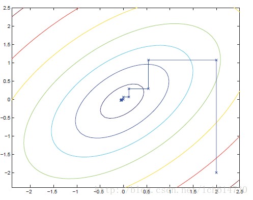 图中的直线式迭代优化的路径,可以看到每一步都会向最优值前进一步,而且前进路线是平行于坐标轴的,因为每一步只优化一个变量。