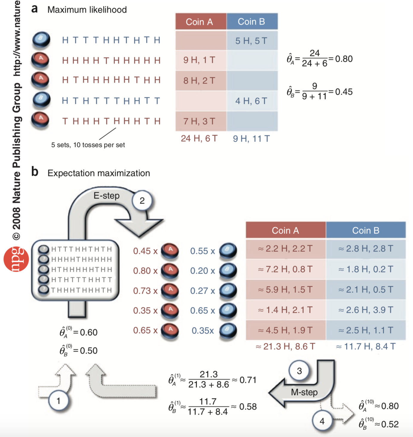假设有两枚硬币A、B,以相同的概率随机选择一个硬币,进行如下的硬币实验:共做5次实验,每次实验独立的掷十次,结果如图中a所示,例如某次实验产生了H、T、T、T、H、H、T、H、T、H(H代表正面朝上)。a是在知道每次选择的是A还是B的情况下进行,b是在不知道选择的硬币情况下进行,问如何估计两个硬币正面出现的概率?