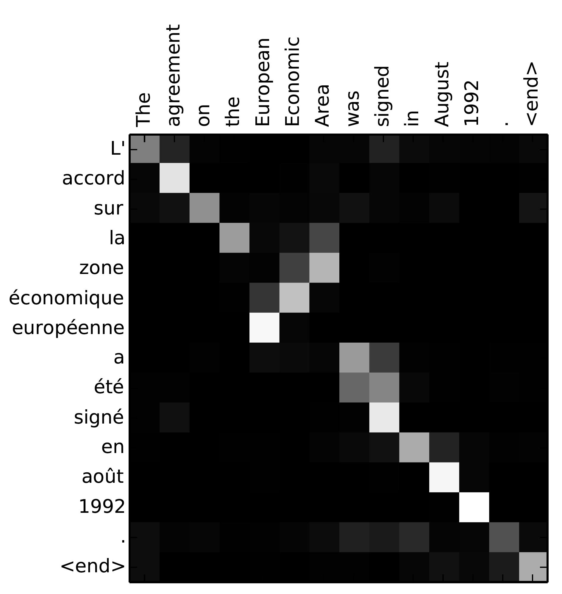 在训练了一些最基本的序列到序列模型之后,我们现在更进一步。为了打造当前最优的神经机器翻译系统,我们需要更多的秘诀:注意力机制。该机制由 Bahdanau 等人在 2015 年首次提出(https://arxiv.org/abs/1409.0473 ),稍后 Luong 等人和其他人完善了它,其核心思想是当我们翻译时通过「注意」相关的源内容,建立直接的短连接。注意力机制的一个很好副产品是源语句和目标语句之间的一个易于可视化的对齐矩阵(如图 4 所示)。