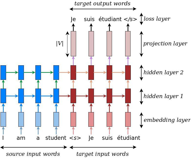 上图将源语言句子「I am a student」翻译成目标语言句子「Je suis étudiant」。此处,「<s>」